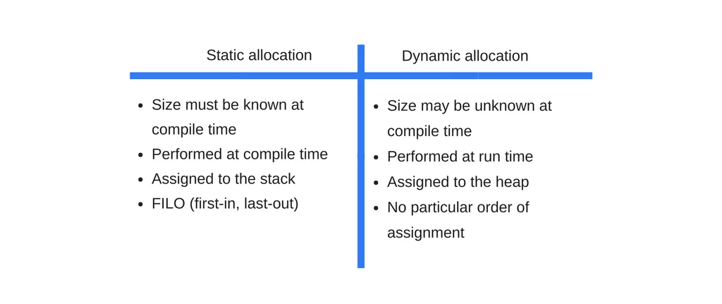 当编译代码的时候,编译器会检查原始数据类型并提前计算出程序运行所需要的内存大小。在所谓的静态堆栈空间中,所需的内存大小会被分配给程序。这些变量所分配到的内存所在的空间之所以被称为静态内存空间是因为当调用函数的时候,函数所需的内存会被添加到现存内存的顶部。当函数中断,它们被以 LIFO(后进先出) 的顺序移出内存。比如,考虑如下代码: