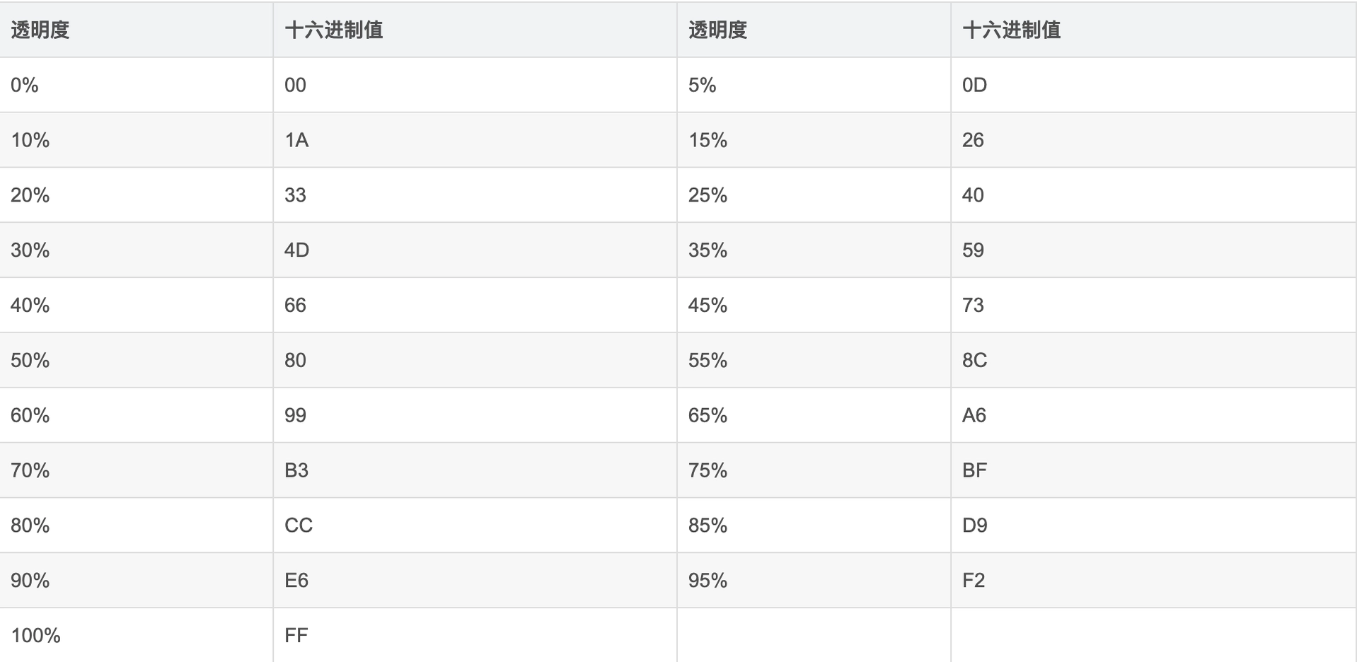 </div>其中R,G,B还是原来的十六进制表示的RGB色值,范围是00-FF;新增的AA,则表示透明度,范围也是00-FF